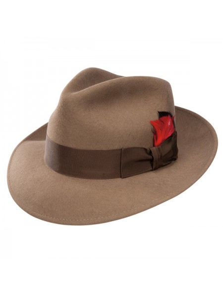 The Gurnee, from Stetson’s Crusher Collection, is sure to turn heads! This hat boasts a pinchfront crown and includes a 2 1/2″ brim. This stylish wool fedora hat also has a fantastic grosgrain hat band that is accompanied by a bow and a feather for accent.
