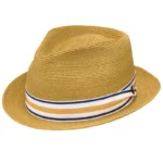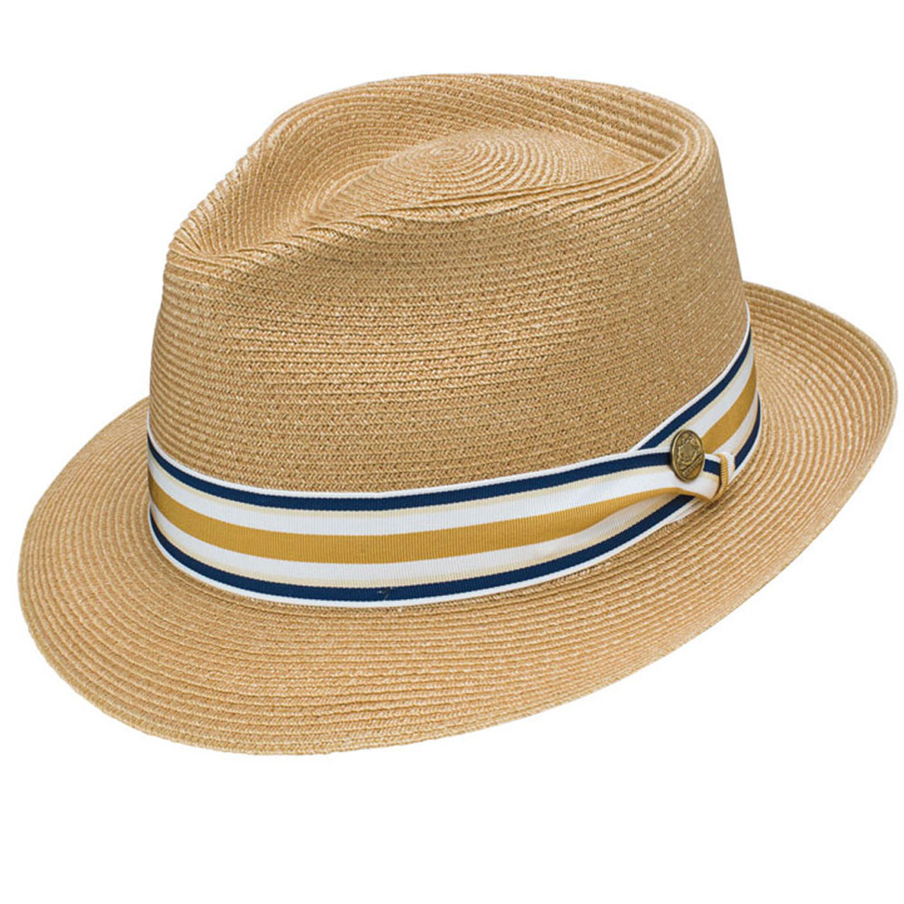 The Luciano fedora by Stetson is a perfect choice for warm Summer months due to its breathable and sturdy braided hemp body construction. Available in Mustard or Navy color choices. The grosgrain ribbon pug band is accompanied by a removable Stetson pin.