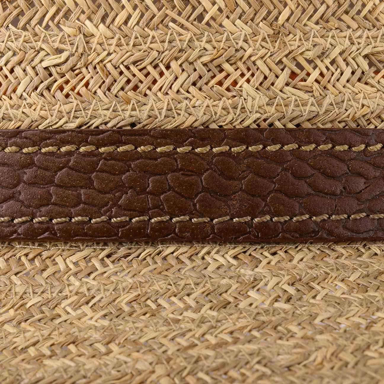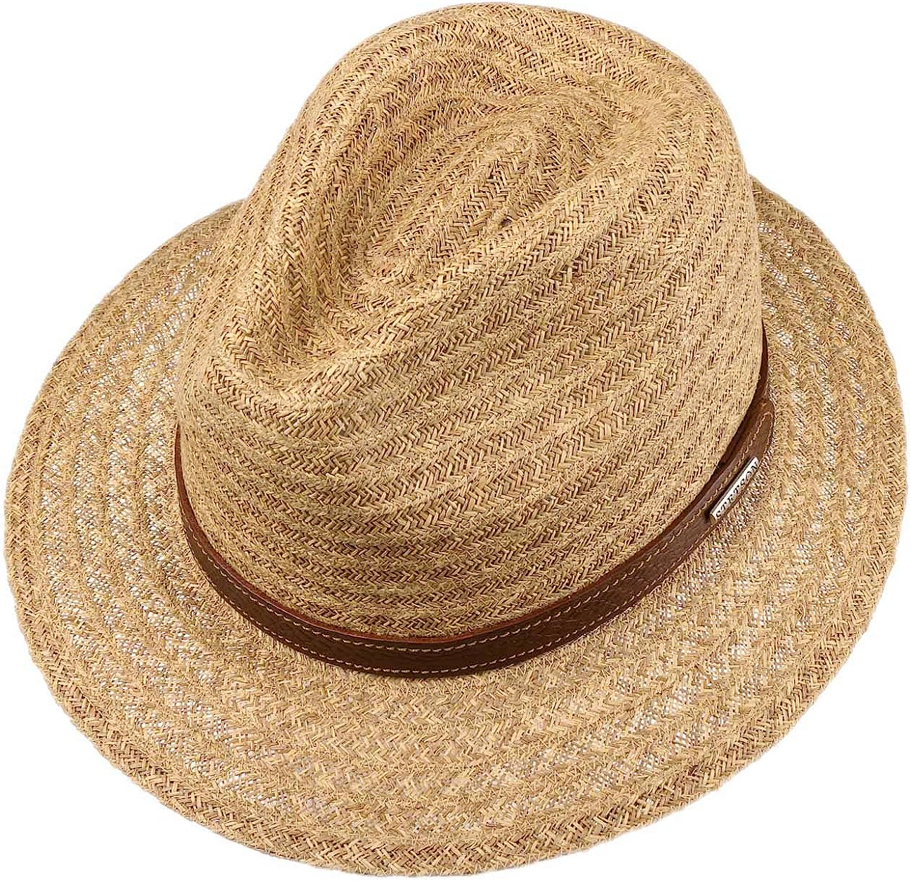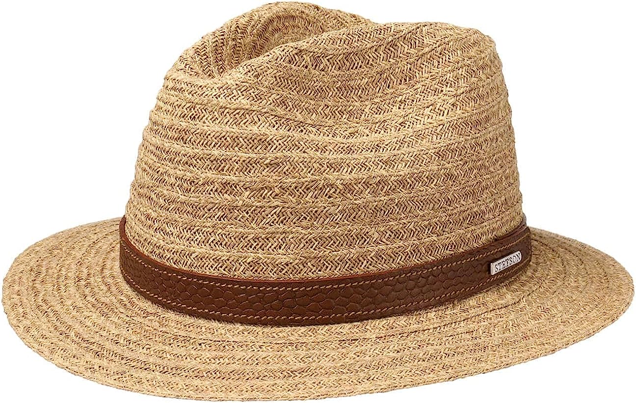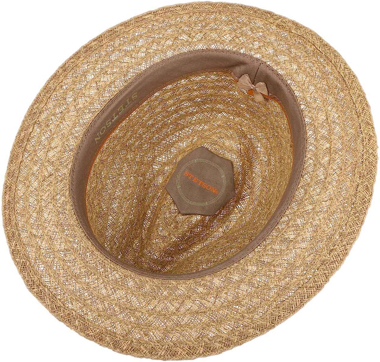 Elegant accessory for holidays and your free time. The lovingly and carefully crafted woven straw that makes up this high-quality straw hat from Stetson attracts attention. 100% cleverly woven raffia straw creates an inspiring pattern with zigzags and stripes. The refined appearance brings out the natural colour irregularities in the material in perfect style. A leather trim band rounds off the natural look of this elegant traveller hat. With a lining band made of 100% cotton.