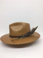 A new Stetson fedora style hat with premium shantung straw build. It features braided leather hatband with feathers, moisture wicking Dri-Lex sweatband, and lacquered firm finish.